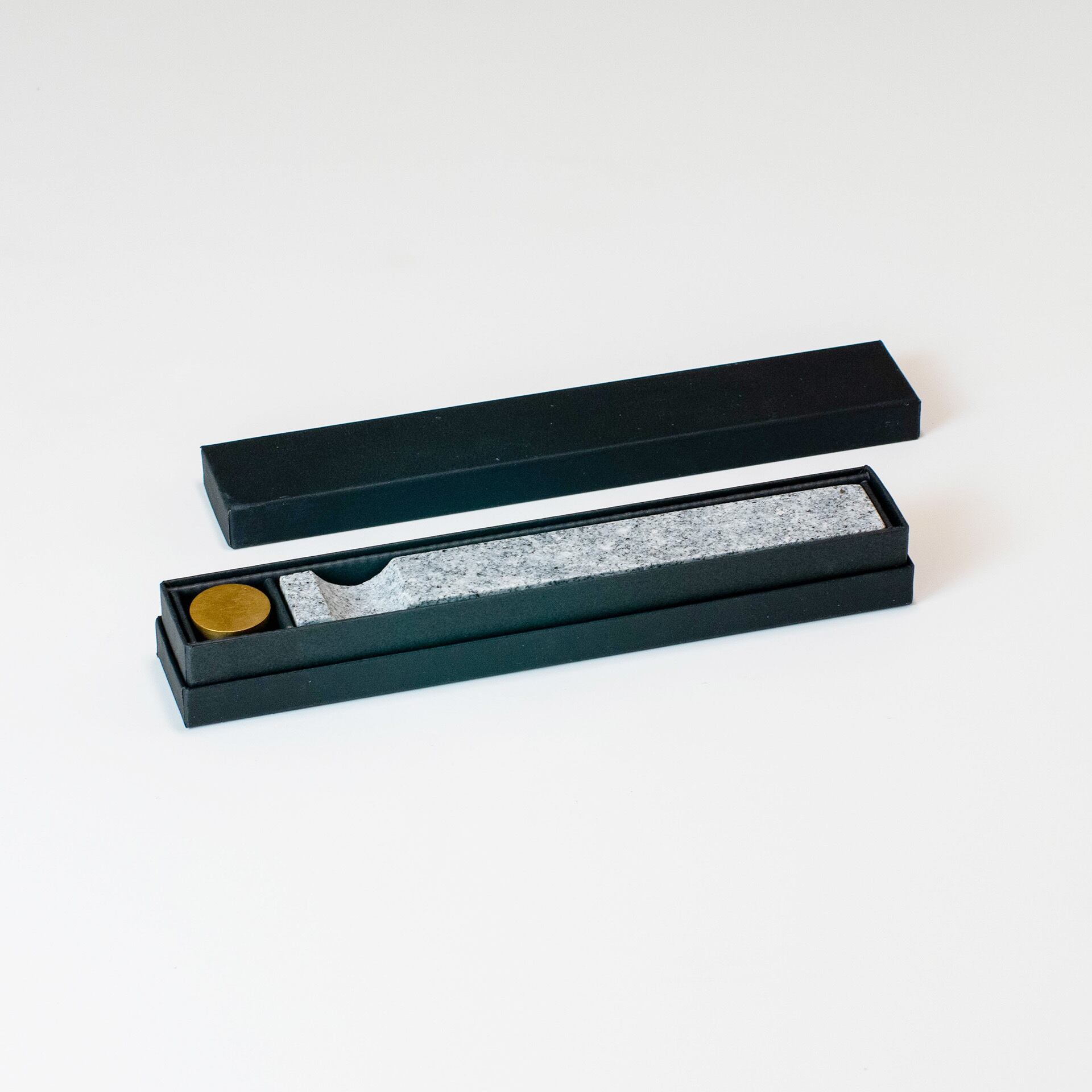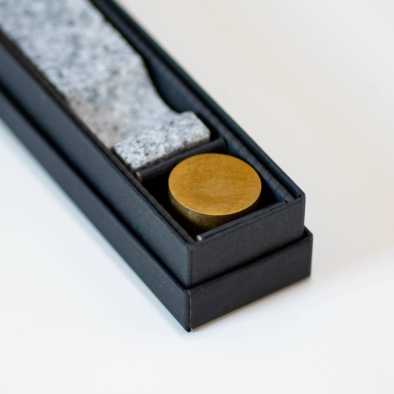 A heavy perforated brass cylinder sits on a granite stone base, subtracting part of its section. The cylinder allows change the incense stick angle, making the piece dynamic and playful. The cylinder can also be placed vertically to serve as an incense cone burner.